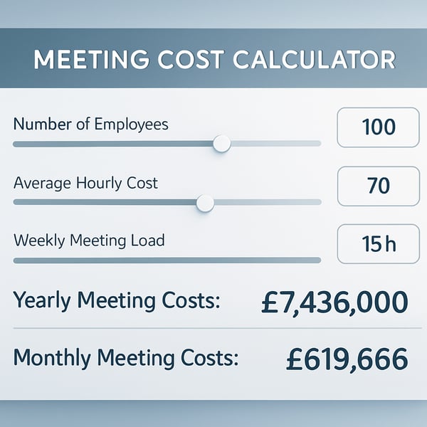 For example, an organization with 260 employees, averaging £55 per hour and spending 10 hours per week in meetings, spends over £7.4 million per year on internal meetings. Reducing that by just 5% equates to £370,000 in annual savings, achieved purely through time optimization.